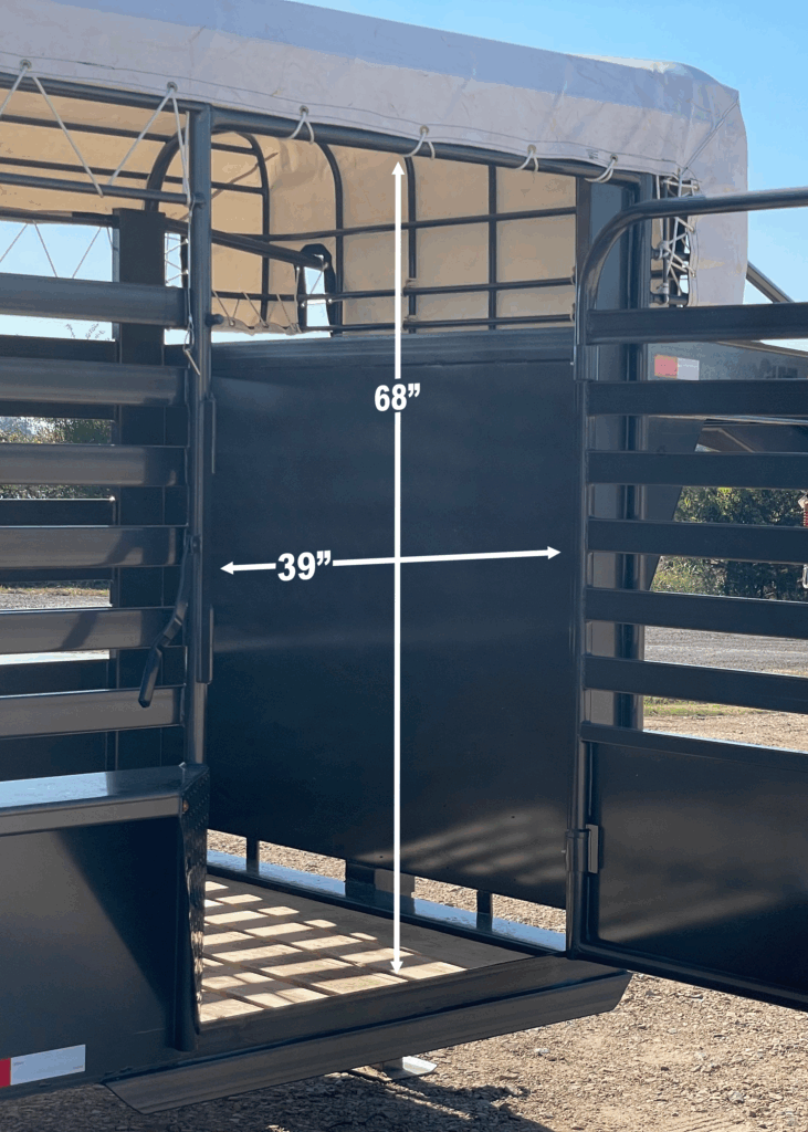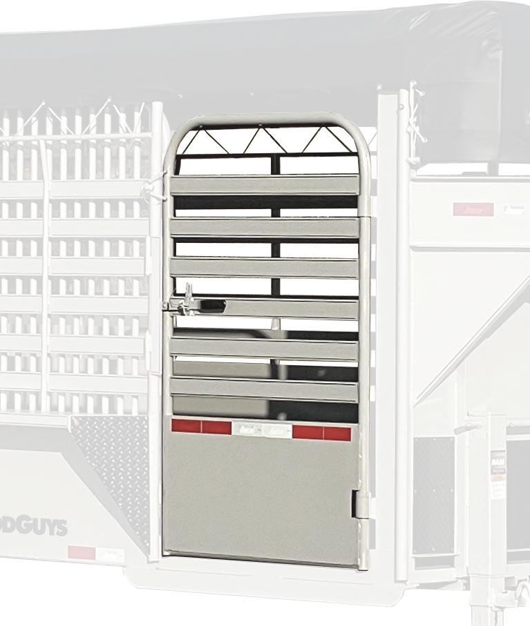 The full escape door option makes for a quick exit from the from the front compartment of our gooseneck livestock trailers (Wrangler Bar-Top, Stockman Steel-Top, and Maverick Half-Top).  It can also be used to side-load or unload livestock.  All hinges include grease zerks for smooth operation and easy maintenance.